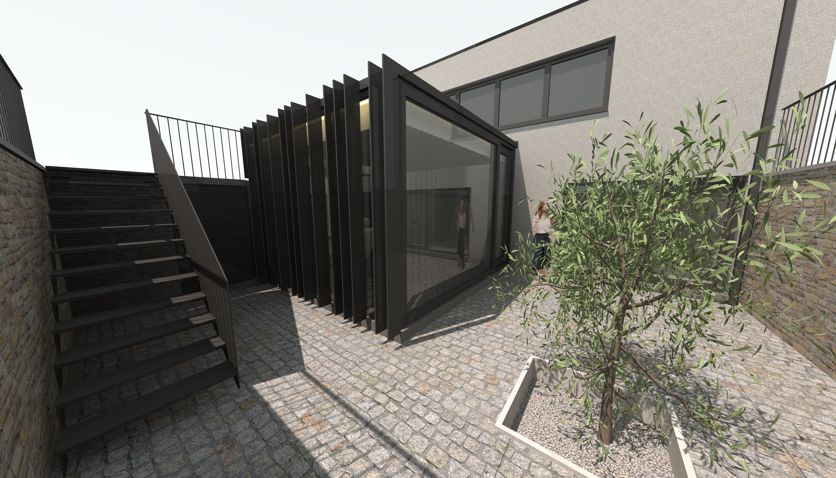 En façade avant, le relief du terrain a été apprivoisé par la création d’une cour, pensée comme un nouvel espace d’entrée. Cet aménagement marque également l’accès à un espace professionnel, subtilement dissimulé. Tel un code-barres architectural, cet espace se révèle progressivement au visiteur au fil de son avancée, jouant sur les perceptions et la découverte.