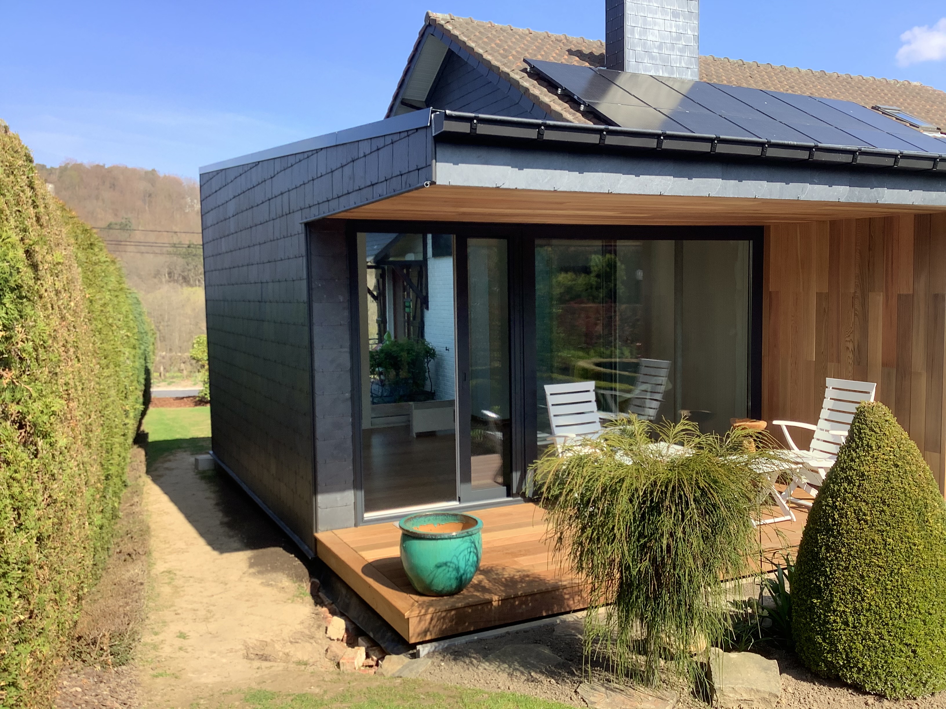Le projet consistait à créer une extension adossée à une habitation existante au caractère affirmé, tout en respectant son identité. Le souhait du client : un nouvel espace de vie traversant, lumineux, et une terrasse couverte tournée vers le jardin.