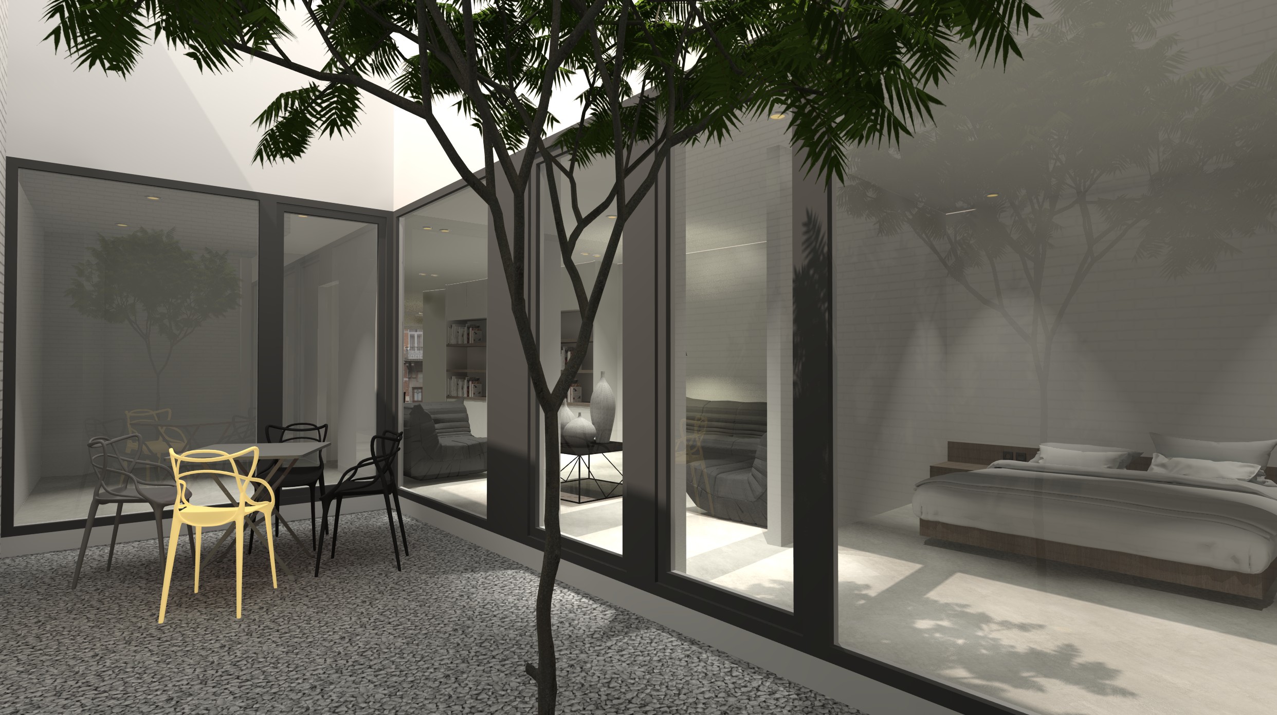 Initialement dépourvu de toute ouverture, ce profond garage paraissait inadapté à un usage résidentiel. Pourtant, l’analyse fine du site a révélé un potentiel insoupçonné : à l’arrière du volume, une toiture plate offrait la possibilité d’y aménager une cour ouverte sur le ciel.