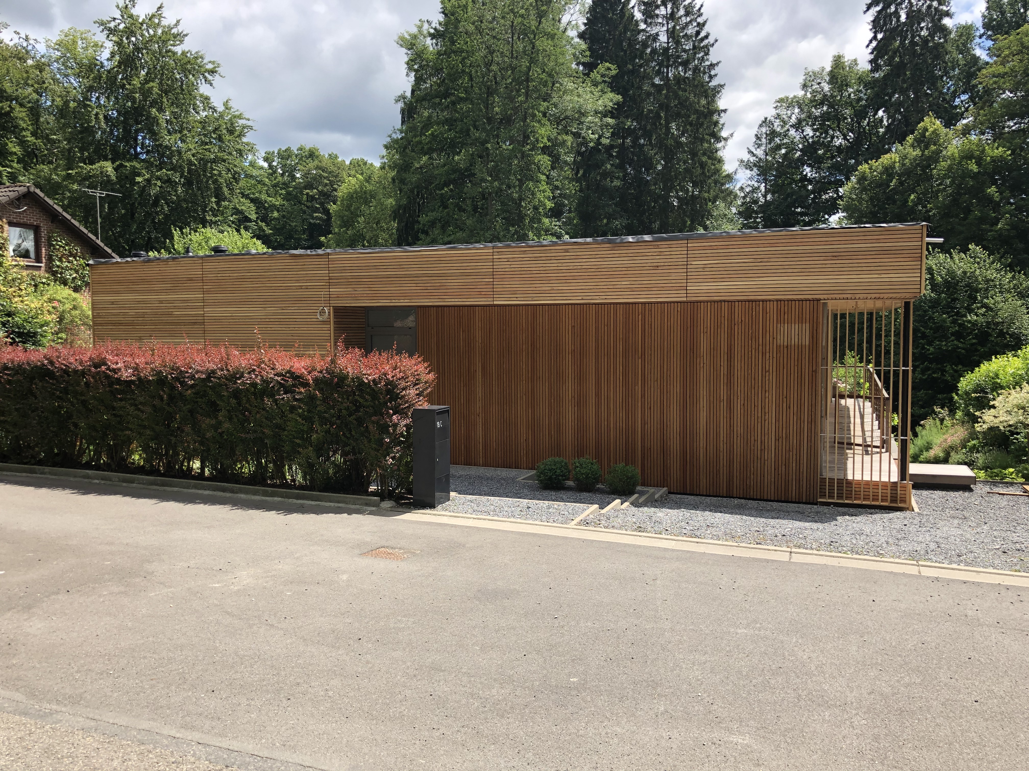 À l’extérieur, un jeu de terrasses accompagne la maison et prolonge les espaces de vie. Ces plateformes, reliées entre elles, offrent une circulation extérieure variée et une succession d’ambiances — tantôt intimes, tantôt ouvertes sur le paysage et le murmure du ruisseau.