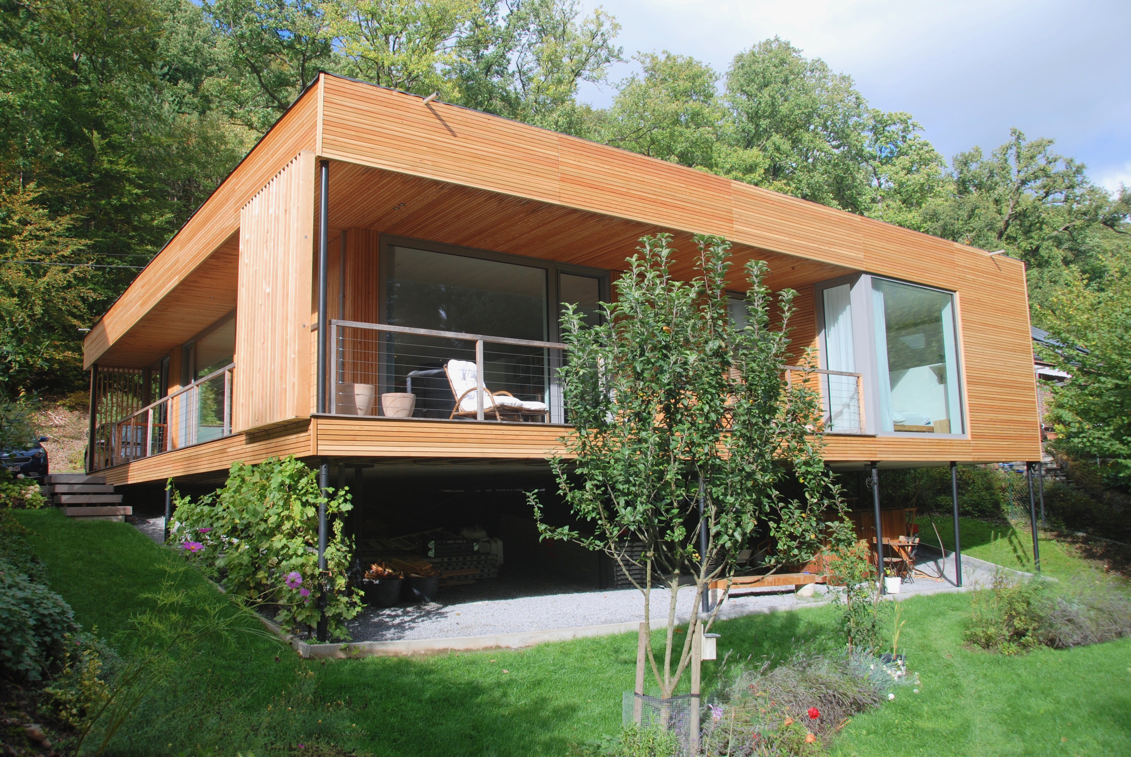 Le bardage en bois naturel enveloppe la construction d’une peau chaleureuse et discrète, assurant son intégration harmonieuse dans l’environnement boisé. Entre nature et architecture, cette maison suspendue compose un lieu de vie simple, apaisé et profondément lié à son site.