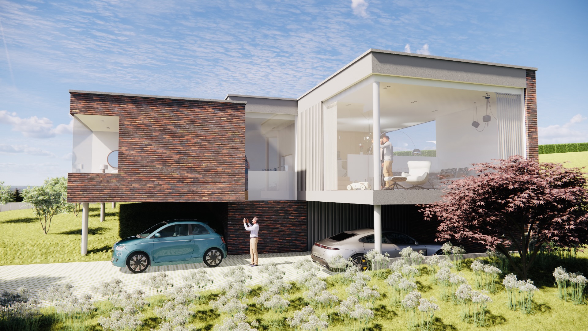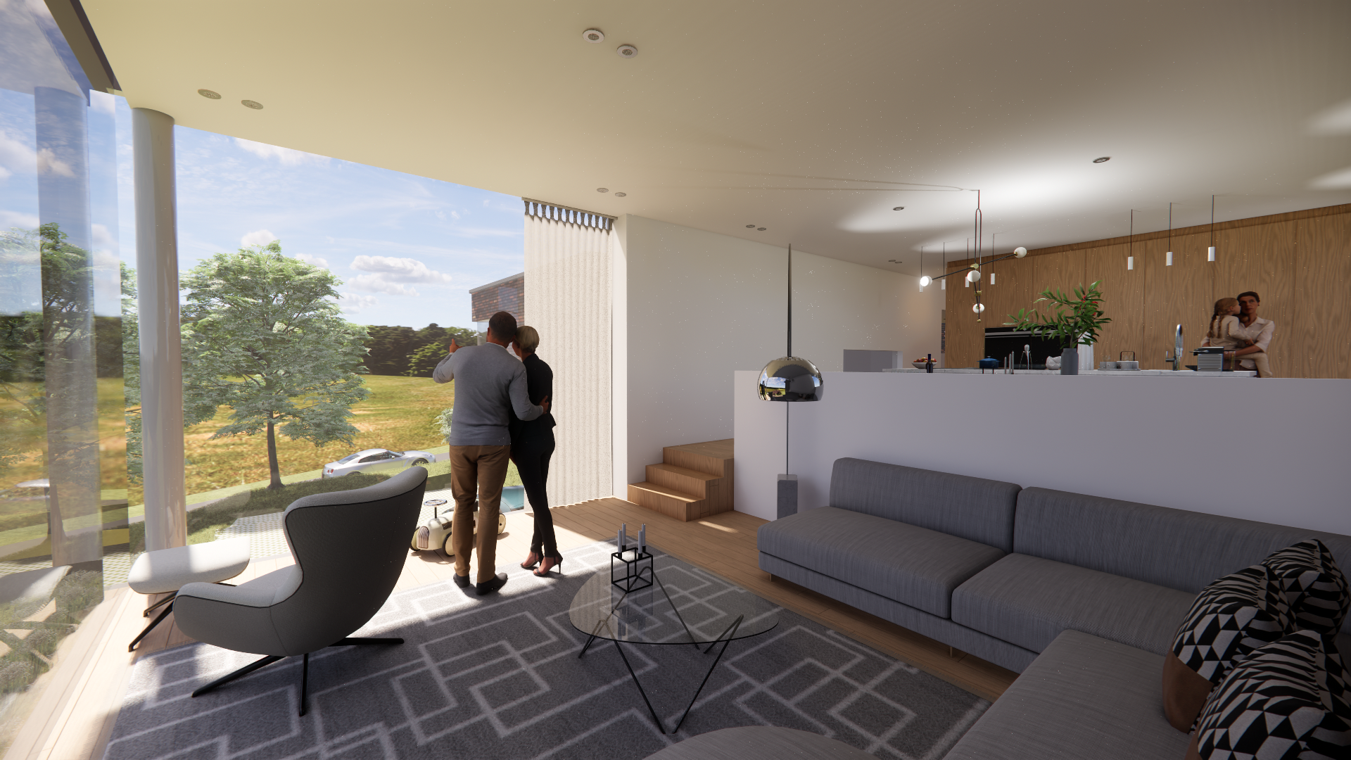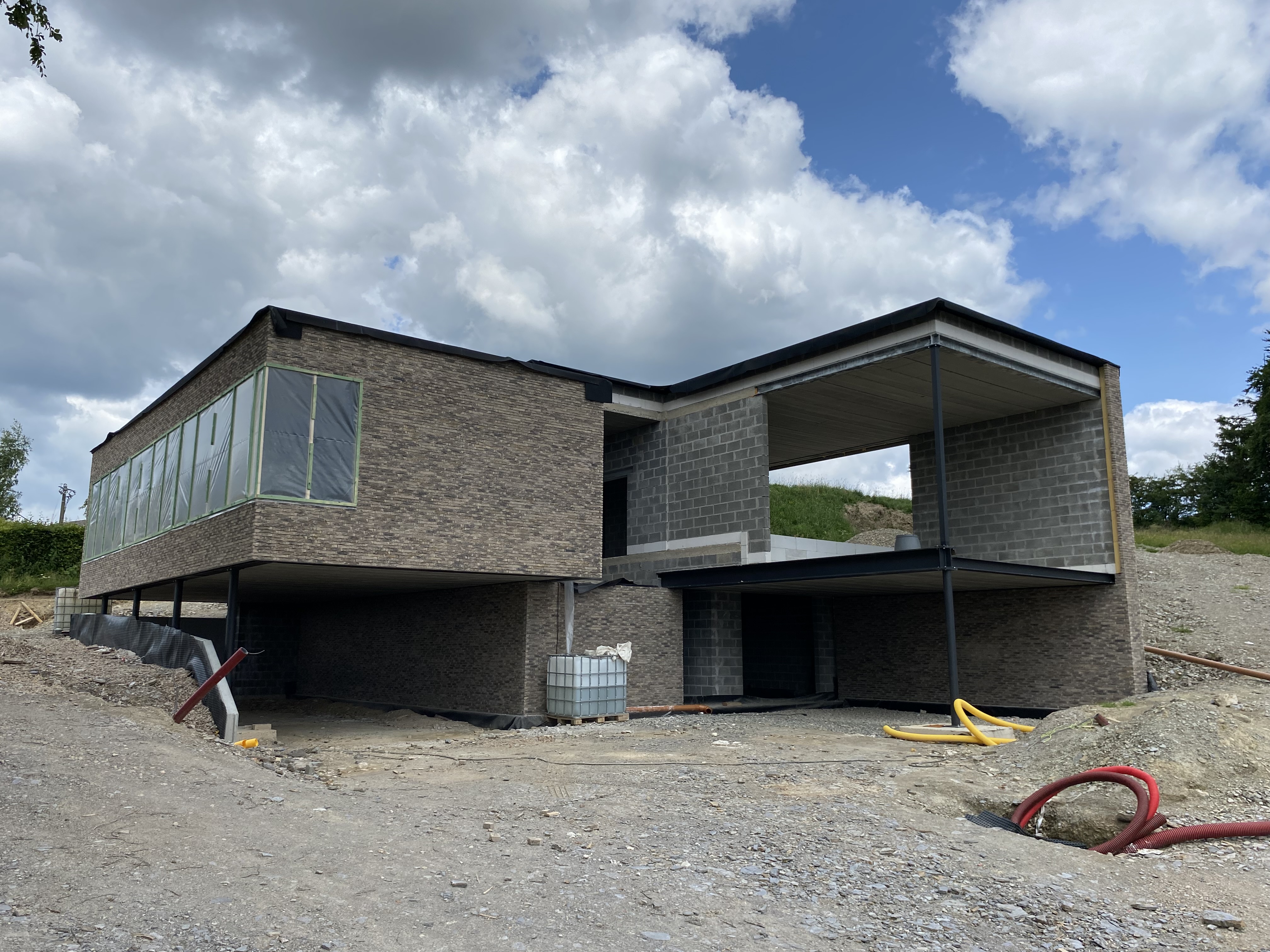 L’implantation a été soigneusement étudiée afin que l’ensemble des ouvertures principales s’orientent vers le panorama exceptionnel des Ardennes. Grandes baies vitrées, terrasses et espaces de vie bénéficient ainsi d’une vue dégagée, renforçant le lien entre l’habitat et son cadre naturel.
