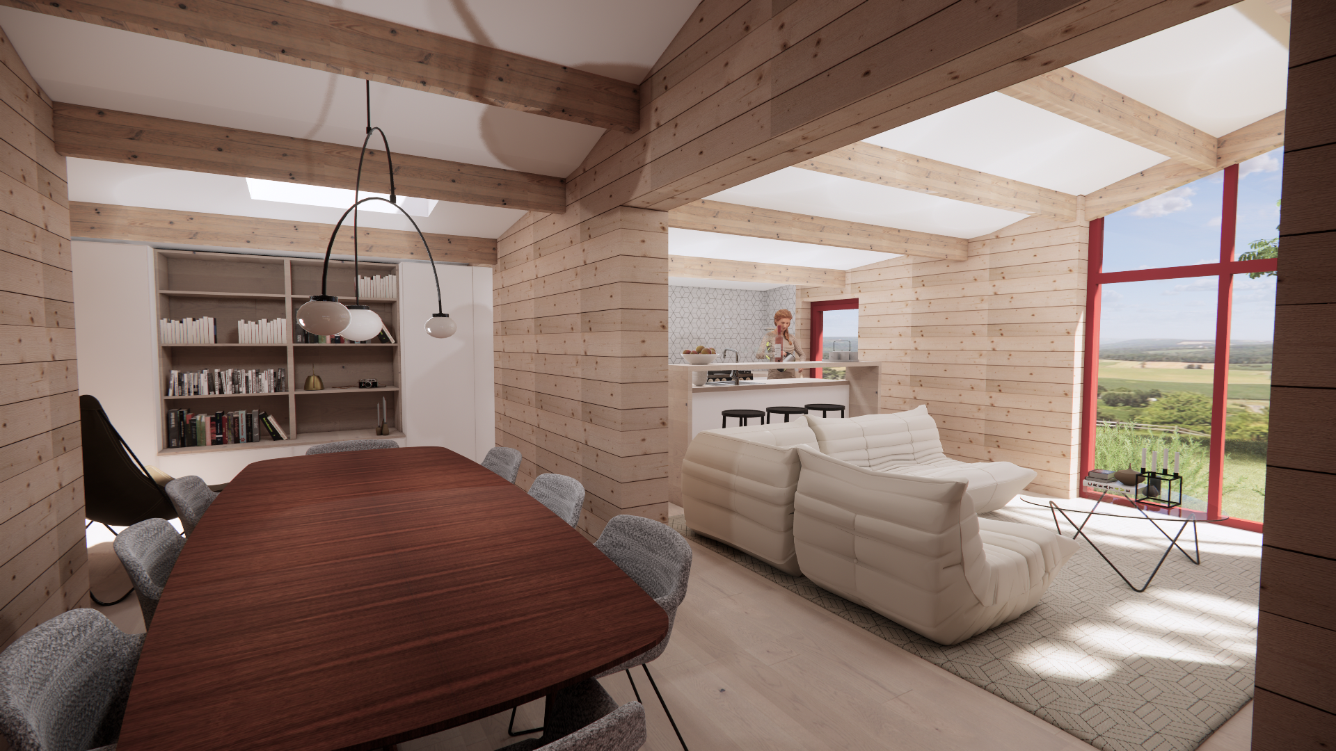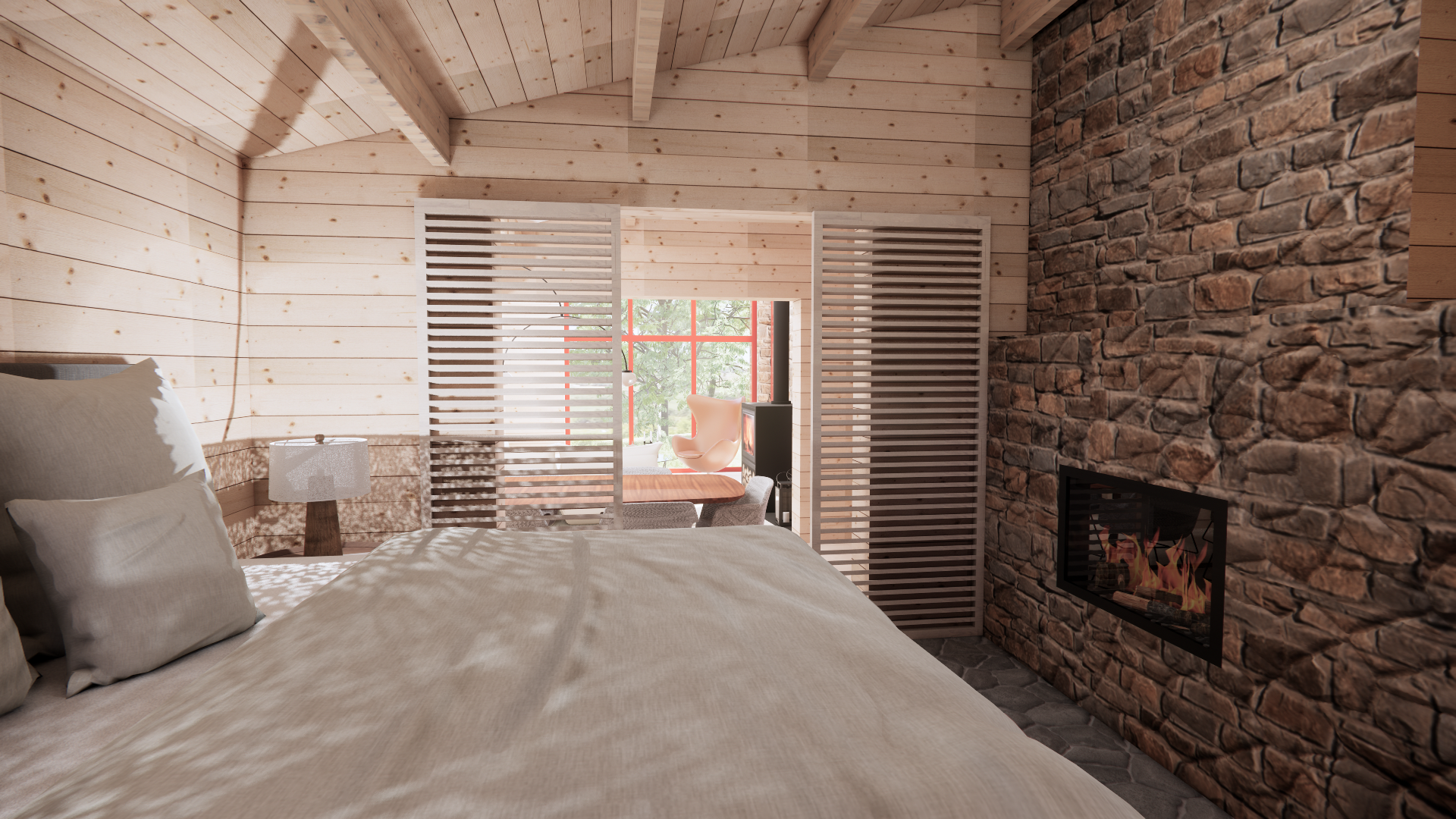 Si l’extérieur préserve l’apparence authentique du chalet, l’intérieur bénéficie, quant à lui, d’un nouvel apport de lumière et d’ouvertures. Le projet offre ainsi des espaces de vie ouverts sur le cadre boisé exceptionnel du site, renforçant le lien entre l’habitation et son environnement naturel.