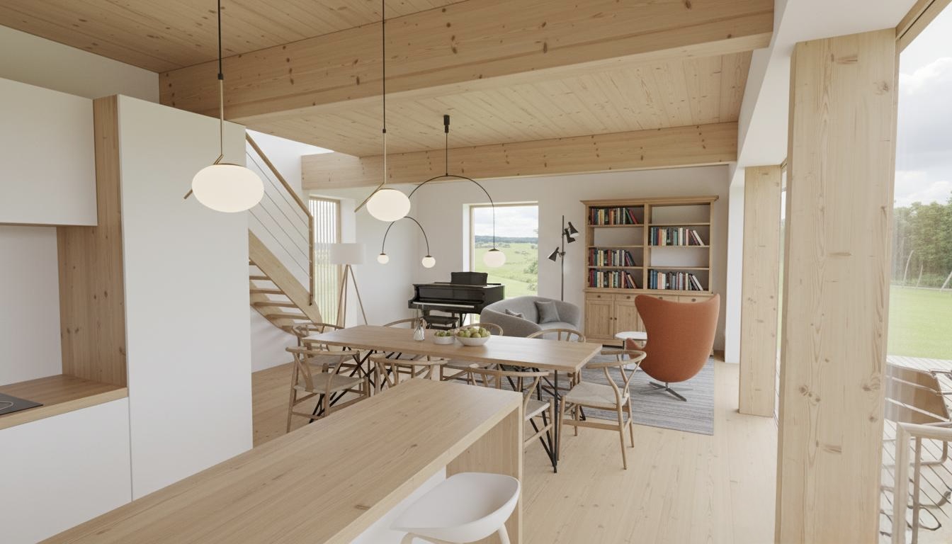 Pensée pour le confort et la vie familiale, elle regroupe trois chambres, des espaces de service fonctionnels et un séjour lumineux, conçu pour accueillir un piano, cœur de la maison. Les lignes sobres et les teintes naturelles du bois favorisent l’intégration dans le paysage et offrent de larges vues sur la colline d’en face.